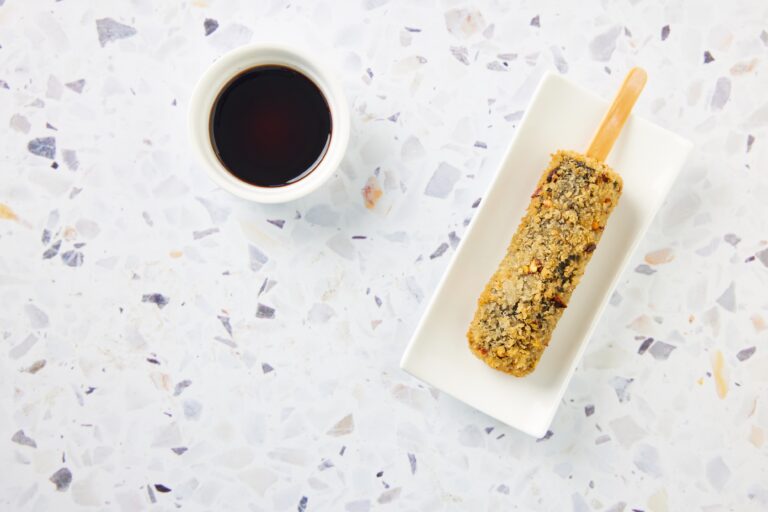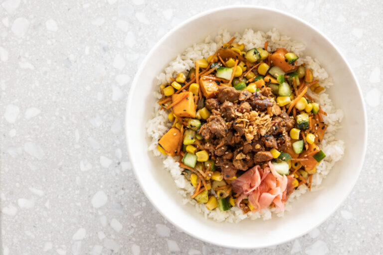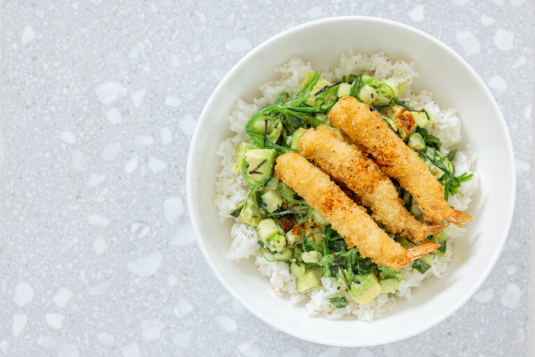 Een warme bowl met Indonesische twist gemaakt in samenwerking met sterrenchef Ron Blaauw! Tempura shrimp geserveerd met sushi rijst, een gekookt ei in traditionele telor saus, haricot verts en pickled veggies, geserveerd met smeuïge Kerrie Mayo en gegarneerd met emping, seroendeng, knoflook chili crunch en lente-ui.