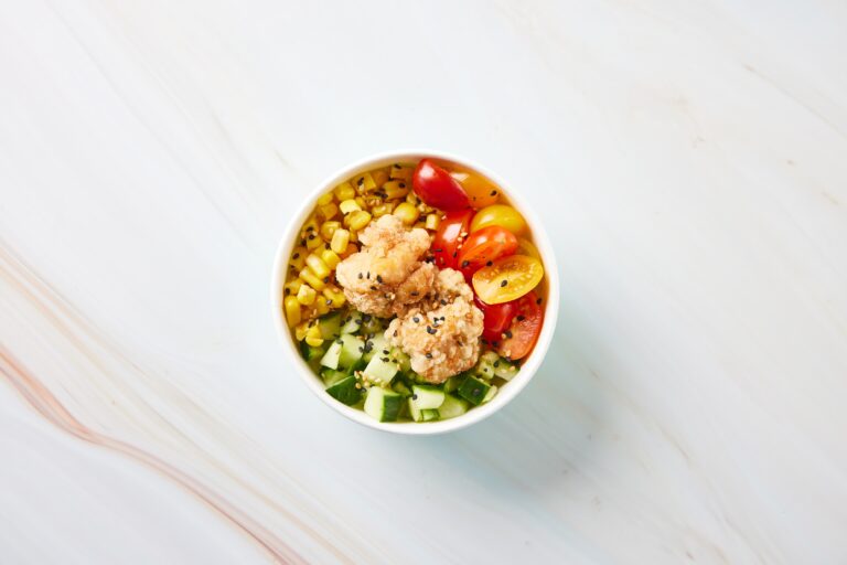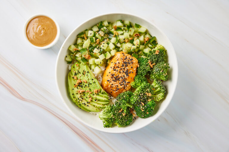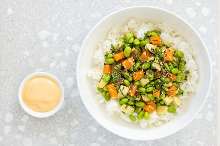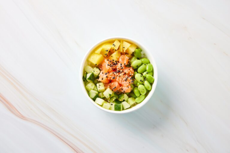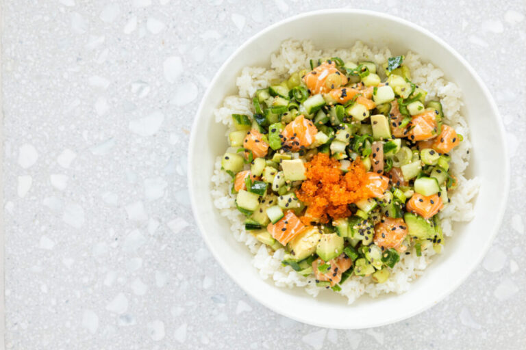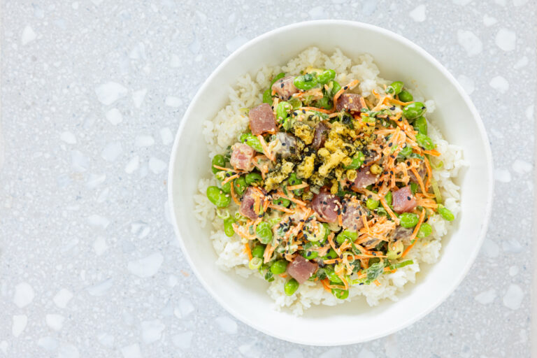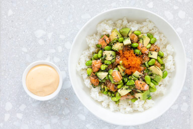 Alles wordt standaard bereid met sushirijst als basis – dit kan op verzoek worden vervangen door quinoa, boerenkool of salade.