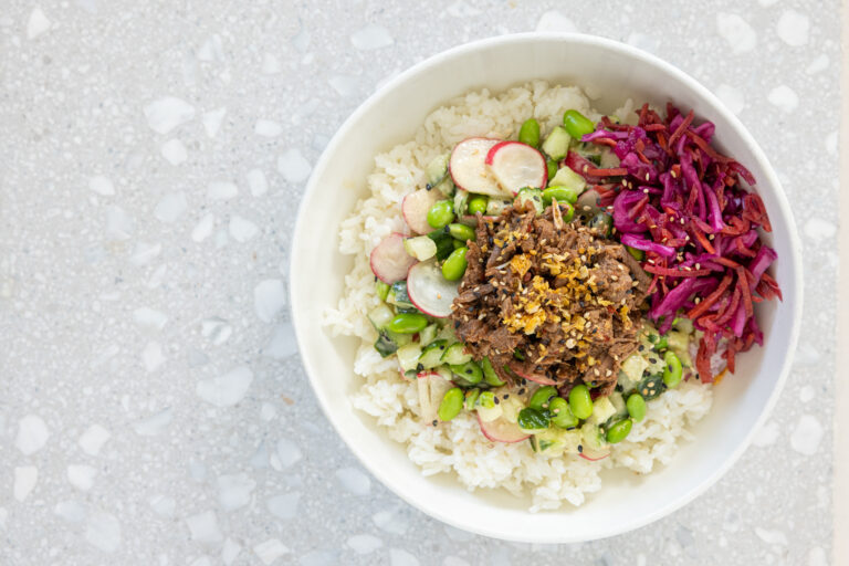 Een warme bowl met Indonesische twist gemaakt in samenwerking met sterrenchef Ron Blaauw! Beef rendang geserveerd met sushi rijst, een gekookt ei in traditionele telor saus, haricot verts en pickled veggies, geserveerd met smeuïge Kerrie Mayo en gegarneerd met emping, seroendeng, knoflook chili crunch en lente-ui.